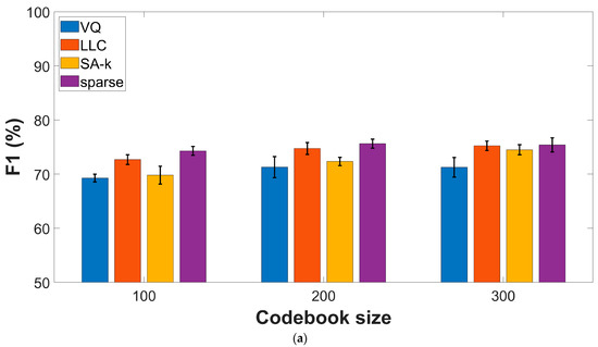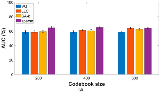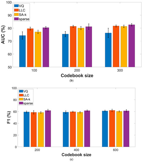 Figure 3 presents comparative AUC and F1 scores for the four feature extraction methods described in the previous section. All experiments considered the sparse encoding procedure based on the online algorithm introduced in [29], with a varying number of codewords. A five-fold cross-validation was performed, and each experiment was repeated ten times to compensate for possible bias in the data-splitting procedure. Performance metrics are reported regarding average values ± standard deviation across all experiments.