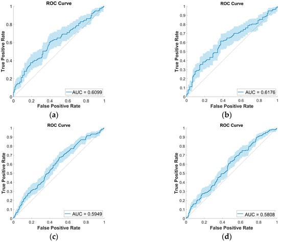 ROC curves for COVID-19 Sounds training set and external test set experiments: (a) Test set from COVID-19 Sounds dataset, input fusion, sparse encoding, 400 codewords; (b) Test set from COVID-19 Sounds dataset, output fusion, sparse encoding, 400 codewords; (c) Test set from COUGHVID, input fusion, LLC encoding, 400 codewords; (d) Test set from COUGHVID, input fusion, sparse encoding, 400 codewords.