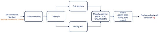 The methodology for traffic prediction involves several steps to obtain the best prediction based on the configuration and the model used. The process is illustrated in Figure 1. The diagram starts with raw data input, obtained from an online monitoring platform. The data are then processed for cleaning and adjustments to be used in simulations. Next, the data are divided for validation processes. Then, simulations are run using different neural networks, and their performance is evaluated using metrics such as prediction performance in terms of RMSE, MAE, MAPE, and computational time. Finally, the best prediction model is chosen.