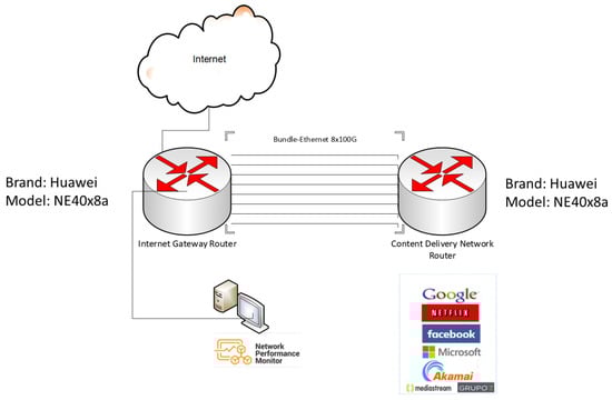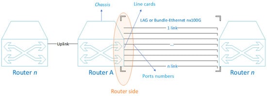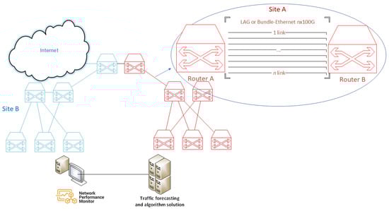Some TSOs have designed networks with redundant links to avoid congestion in high-availability schemes (active/passive configuration) and load balancing (active/active configuration) [3]. From the perspective of energy efficiency, these designs can be considered as inefficient energy expenditure, because these links are always active [4]. The studies in [5,6] show that links are underutilized by only 40% in the central network, commonly called core network (CN), and that during off-peak hours, it is much lower. Moreover, there is not much difference in energy consumption between equipment at full load and standby mode [5]. To increase bandwidth capacity, TSOs connect the routers through multiple physical cables that form a single grouped logical link. The grouped logical links are also called link aggregation groups (LAG) or bundle Ethernet (BE). Link aggregation in the Ethernet was standardized in the IEEE 802.3ad standard and later renamed as IEEE 802.1ax to maintain consistency with other 802.3 standards [7].