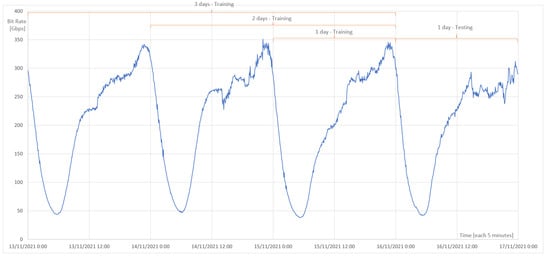 The utilization of a network monitoring platform is necessary in order to continuously monitor the traffic on routers and provide real-time statistics on various time scales, including but not limited to minutes, hours, days, and months. This results in the accumulation of a significant amount of data, which can be categorized as big data and is structured in the form of a time series. The platform stores this information for a minimum duration of 1 year, and the monitoring system updates the data every 5 min, with the precise time span being contingent on the system in use. The collected data serve as inputs for prediction models. It is imperative to note that for this particular use case, the effective monitoring of the traffic on TSO network routers can only be achieved through the utilization of the network performance monitor platform in conjunction with the simple network management protocol (SNMP).