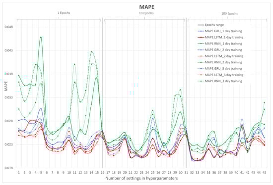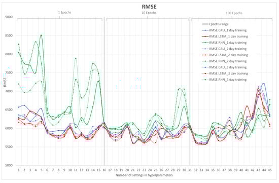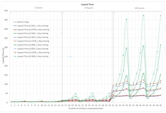 The root mean square error (RSME), the mean absolute error (MAE), and the mean absolute percentage error (MAPE) metrics are used to evaluate the performance of prediction models. These metrics provide a systematic approach for evaluating the accuracy of a model’s predictions and facilitate the comparison of the performance of different models. Furthermore, it is important to consider computational time, namely how long it will take to process the prediction.