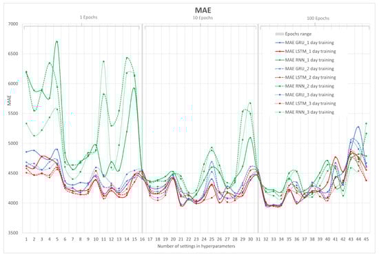 For prediction models, the goal of evaluation metrics is to minimize error. For regression and prediction models, MAE and RMSE metrics are most commonly used to evaluate the performance of the model. For example, in studies such as [15,19,37,47,48,49,50], the RMSE metric has been used, and in others such as [36,37,47,51], the MAE metric has been used. The mean absolute percentage error (MAPE) is also used in some cases to evaluate regression and prediction [52,53]. RMSE and MAE are metrics that are dependent on the scale. MAPE is a percentage error metric. The RMSE metric is very sensitive to outliers, while the impact of these is reduced with MAE. On the other hand, MAE cannot indicate the bias of predictions in terms of overfitting or underfitting. MAPE can differentiate this type of bias and imposes a penalty on predicted values above the real ones.