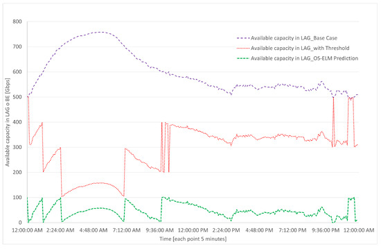 The current CN of a TSO is composed of multiple networks, and trunk lines are often formed by many grouped optical fibers to increase capacity and add resilience. Connections with the number of sublinks within a BE or LAG range from 2 to approximately 20 in a typical TSO [6]. Additionally, there is the problem of the energy consumption of these links, which is even more when they are grouped. In recent years, several works have been published and proposed to reduce the energy consumption of simple links (unaggregated) [8]. One of the standards that helps solve this problem is IEEE 802.3az, which specifies Ethernet energy efficiency (EEE), which is a method for reducing the energy used by an Ethernet device during low link utilization periods [9]. The premise of EEE is that Ethernet links have idle time and therefore the opportunity to save energy during that period of time. The method is called low power idle (LPI), but it is only for copper interfaces [10]. Regarding LAGs, several energy efficiency studies have been carried out using different optimization methods [6]. Additionally, there are works that propose threshold point algorithms, as in [11], and others [12] that work with software-defined network (SDN) controllers. Moreover, ref. [13] has used predictive techniques to reduce LAG energy, using a simple moving average (SMA).