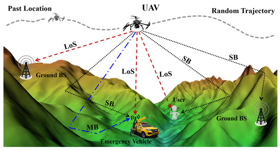 A brief description of the UAV-assisted emergency communications network architecture in complicated mountainous scenarios is shown in Figure 1. The UAV side is set as Tx, and the ground side is set to Rx. Due to the complex terrain, mountains of various morphologies can bring more reflections and cause multipath fading. The UAV AG channel modeling in complicated mountainous scenarios needs to consider all possible multipath types. Here, the entire communications link contains three components: The line-of-sight (LoS) component represents the UAV communications directly with the ground end, and the LoS component usually has the largest power. The single bounce (SB) component means the received signal is reflected once to reach the ground end. In mountainous scenarios, the SB generally divides into two categories—one is the scattering path due to ground reflections near the Rx, and the other is from the mountains. The multiple bounce (MB) component indicates that the received signal experiences the effects of multiple environmental characteristics during propagation, e.g., it reaches the Rx end after one reflection from a mountainous area and then another reflection from the ground. The MB power is often low and not easily detected by the Rx.