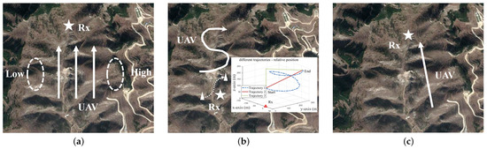 Satellite view and flight detail sketch of research on (a) UAV flight positions, (b) UAV flight trajectories and altitudes, and (c) UAV carrier frequency and environmental factors (The arrow represents the flight direction, the circle represents the approximately location of the mountain, the triangle represents the starting and ending points of different trajectories, and the star represents the Rx).