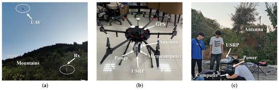 (a) Channel measurement environment, (b) UAV transmitter, and (c) ground receiver in mountainous scenarios.