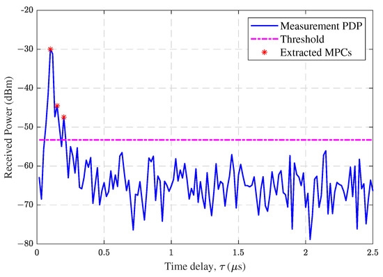 Based on the acquired CIRs , the MPCs can be extracted by the peak search algorithm to further analyze the channel characteristics. The peak search power threshold is chosen as the maximum value between the maximum power minus 20 dB and the average noise floor plus 5 dB [15]. As an example, Figure 5 shows the results of MPC extraction for the 93rd point of horizontal flight at a vertical altitude of 40 m. The threshold in the figure is −53.30 dBm, and channel data below the threshold is considered to be noise. The value of extracted MPCs is the received power, and the corresponding time point is considered as the delay. The first arrived path is seen as the LoS path, which has the minimum delay. Here, the delay of LoS path was 0.10 μs. In addition, the delays and powers of the corresponding NLoS paths could be further obtained.