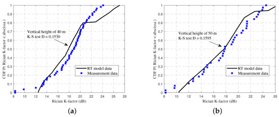 Using exactly the same frequency, bandwidth, and flight speed as the real measurements, the propagation environment in WI software was reconstructed. The Rician K-factor was calculated from Equation (6). Figure 6 shows the cumulative distribution functions (CDFs) of the Rician K-factor for the RT data and measurement data. When the flight height was 40 m, the average values of the Rician K-factor for the RT data and measured data were 18.32 and 18.23, respectively. When the flight height was 50 m, the average values were 17.33 and 17.80, respectively. The CDF curves of the measured and simulated data were well fitted intuitively. Besides, to make the data more convincing, the Kolmogorov–Smirnov (K-S) test was employed to measure its accuracy and effectiveness. The K-S distance test value is typically utilized to compare if two distinct data sets stem from the same underlying distribution. The results show that the K-S test distance values (D values) for flight altitudes of 40 m and 50 m were 0.1530 and 0.1595, respectively. Through the comparison, we can see that the K-S test D values were below 0.21 (the upper quantile of 95% significant level) [40]. Hence, it can be assumed that the RT data and measurement data followed the same distribution. Therefore, the accuracy and practicality of the RT method and simulation results could be well demonstrated.