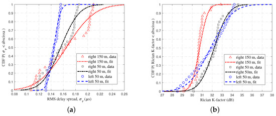 Figure 8 shows the CDFs of the RMS DS and Rician K-factor and the fitted curve using a Gaussian stochastic process. When the UAV was 150 m to the right of the Rx at a horizontal distance, it was greatly influenced by the mountain. The scattering path shared more energy, and the LoS path accounted for a relatively small percentage. Consequently, the average of the RMS DS was large, and the average of the Rician K-factor was small. For the Rician K-factor, the variance was small when the UAV was close to the mountain, thus indicating that the fluctuation was small with the movement of the UAV. In addition, the Rician K-factor was almost identical for the left and right 50 m. It is evident that the proximity to the mountain exerted a significant influence, thereby resulting in a richer scattering path and greater losses, which ultimately led to a decline in communications quality. Meanwhile, our empirical findings demonstrated conformity with our experimental expectations, which can be deduced from the data to draw the conclusion.
