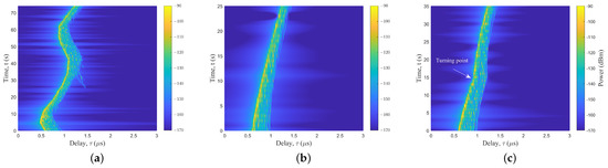 UAV always fly with a 3D arbitrary trajectory and different flight altitudes. After determining the start and end positions of the UAV flight, there are often three types of flight: hovering flight (trajectory 1), point-to-point direct oblique flight (trajectory 2), and vertical flight to the end point altitude, followed by horizontal flight to the end point (trajectory 3). The trajectories are shown in Figure 3b. The trend of the PDPs at different trajectories can be observed in Figure 9. In Figure 9a,b, a clear difference between the two trajectories, hovering and straight, can be evidently observed. In Figure 9c, the turning point where the UAV changes from vertical to horizontal flight can be seen at 15 s. The delays of the LoS trajectories at the start about 0.6 μs and end points about 1.2 μs of the three figures were the same but at other times were different, thus verifying that the location points at the start and end points were the same, but the routes were different.