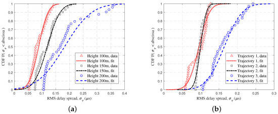 The CDFs of RMS DS for UAV flight with (a) different flight altitudes and (b) different flight trajectories.