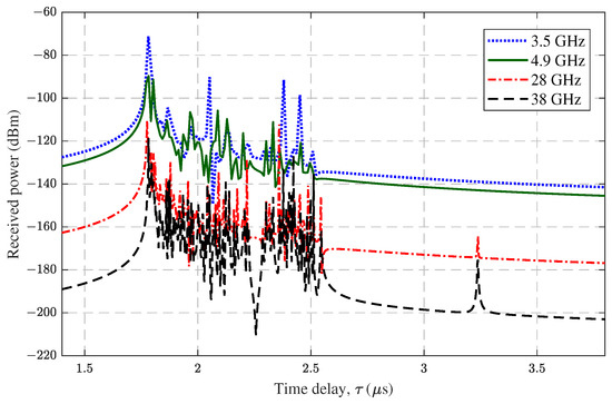 The selection of the frequency bands often has an impact on the propagation channel. The choice of frequency bands in 6G UAV-assisted emergency communications is still undetermined. Therefore, in this paper, the frequency bands 3.5 GHz, 4.9 GHz, 28 GHz, and 38 GHz were selected, and the bandwidths were set to 80 MHz, 80 MHz, 1 GHz, and 1 GHz, respectively. As an example, the PDP at the flight time of 10 s at different frequency bands was selected, as shown in Figure 13. The summation power of the MPCs could be calculated as −42.46 dBm, −45.89 dBm, −59.44 dBm, and −62.37 dBm. The LoS delay was basically the same, while the power was significantly different between four different frequency bands. The mmWave attenuation was significantly greater than sub-6 GHz and tended to become greater with increasing frequency. The reflected and scattered multipaths in each band had similar time delay distributions overall, but there were some differences. For example, the multipath at the 3.2 μs time delay was observed only at 28 GHz and 38 GHz. In addition, due to the large bandwidth of mmWave and the high time delay resolution, the mmWave was susceptible to the influence of mountains, and the scattering phenomenon was more obvious.