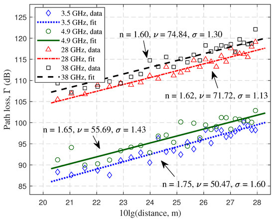 where n is the PL exponent (PLE), denotes the intercept, and d is the 3D straight-line distance from the Tx to Rx in m unit. SF is caused by obstacles between the Tx and Rx and tends to obey a Gaussian distribution with a zero mean and standard deviation of . Therefore, the fit is generally carried out with three parameters: n, , and .