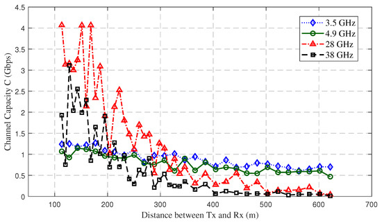 Figure 16 shows the channel capacity at different frequency bands. The 3D straight-line distance of the Tx and Rx ranged from 113 m to 622 m, and the UAV flight trajectory details are shown in Figure 3c. At 28 GHz and 38 GHz, both the CIR complex matrix and SNR were small at long distances due to the large attenuation in mountainous scenarios. Therefore, the channel capacity was reduced for 3D distances greater than 400 m, even when multiplying by a wider channel bandwidth B. When the distance was less than 250 m, the mmWave channel capacity increased dramatically, up to 4.1 Gbps. Due to the greater attenuation at 38 GHz, the 28 GHz frequency band could provide higher channel capacity than the 38 GHz band overall. When the 3D distance from the Tx to Rx exceeded 400 m, the attenuation of the mmWave was too large to provide stable communications, and the sub-6 GHz channel capacity fluctuated less. In general, when the 3D distance is below 200 m, the mmWave can provide better communication services during emergency communications in mountainous scenarios. In the future, massive multiple aircraft mmWave antennas can be used to obtain diversity gain, and suitable modulation and coding schemes can be used to improve the data transmission rate and interference immunity.
