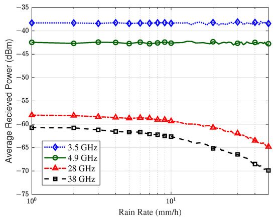 In order to reduce the effect of the error, the average value of the received power for the whole flight trajectory was calculated. Figure 17 shows the simulation results. The rainfall rate R was set from 1 mm/h to 50 mm/h. It can be observed that the UAV AG mmWave channel was easily affected by rainwater and atmospheric components. For 3.5 GHz and 4.9 GHz, the received power hardly declined when the rainfall rate was 1 mm/h to 10 mm/h. However, it declined by 1.31 dB at 28 GHz and 1.91 dB at 38 GHz. For a larger rain rate, some fluctuations were observed at 3.5 GHz and 4.9 GHz, possibly due to random phase effects. In terms of the mmWave channel, the signal propagation attenuation significantly increased with the rainfall rate, especially at 38 GHz, where the maximum attenuation reached 9.15 dB. Therefore, in UAV-assisted emergency communication under extreme weather conditions, it is necessary to consider the impact of precipitation on the channel.
