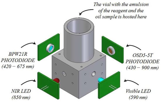 The PLA structure built with the 3D printer is presented in Figure 2. The vial containing the emulsion to be analyzed is hosted in a cylindrical cavity, and two couples of LEDs/photodiodes are integrated in the structure for the optical attenuation measurements. The LED generates the radiation that is transmitted through the emulsion, and the attenuated radiation emerging from the emulsion is detected by the photodiode. In the case of peroxide index measurements, the visible LED with a peak wavelength of 590 nm and the photodiode (BPW21R, Vishay Intertechnology, Malvern, PA, USA) with a wavelength sensitivity range of 420–675 nm is used. In the case of total phenolic content measurements, the near-infrared (NIR) LED with a peak wavelength of 850 nm and the photodiode (OSD5-5T, Centronic, Croydon, UK) with a wavelength sensitivity range of 430–900 nm is used.