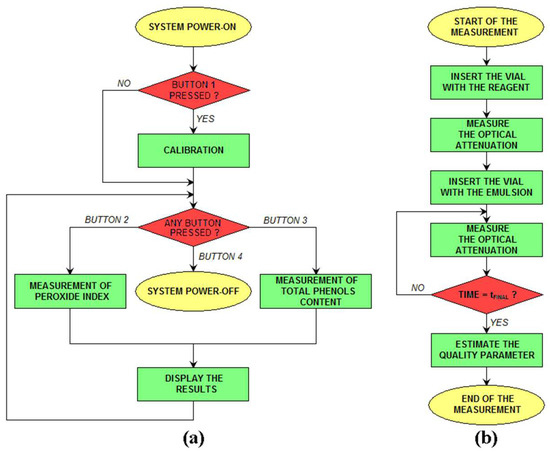 The procedure for olive oil analysis using the proposed sensor system is presented in the flowcharts in Figure 3a,b. When the system is powered on, if button 1 is pressed, the system enters a calibration procedure where the LED intensity is changed to produce a target output value in the case of an empty vial. The value of the LED intensity is then stored on an EEPROM memory integrated in the microcontroller. Then, the system waits for the user to select the action (button 2: measurement of PI; button 3: measurement of TPC; and button 4: power off the system). After the selection, the measurement is carried out, and the results are displayed on the LCD screen. The procedure for a single measurement is presented in the flowchart in Figure 3b. Initially, the LCD screen informs the user to insert a vial with only the reagent, and a measurement of the optical attenuation is carried out to check that the optical properties of the reagent are correct (i.e., the reagent is not degraded). Then, the system asks the user to insert the vial with the emulsion created with the reagent and the oil (the procedure is discussed in Section 2.3), and measurements of optical attenuation are carried out at time intervals of 5 s for a total time of 900 s (15 min). Then, the oil parameter of interest is estimated on the measured value at a particular time (600 s for PI and 500 s for TPC, as will be discussed in Section 3), and such a value is displayed on the LCD screen. Even if the system estimates the quality parameter of interest based on the measurement at a fixed time, the entire dataset (optical attenuation vs. time) is recorded and can be downloaded to a PC for further data processing.