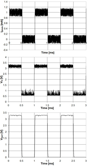 The circuit for the measurement of the emulsion’s optical attenuation is shown in Figure 4. The chip AS1101 (ams-OSRAM AG, Premstaetten, Austria, EU) is an LED driver used to control the two LEDs used in the system. The analog input CTRL is generated using the 12 bit DAC integrated in the microcontroller and used to control the intensity of the current flowing in the LED when in the ON state. The input ON is fed with a PWM signal (frequency 1 kHz, duty-cycle 50%) generated by the microcontroller to drive the LED ON and OFF according to the PWM signal. The LED generates a pulse of light with a frequency of 1 kHz that is transmitted through the vial containing the emulsion. The light emerging from the vial is detected by the photodiode, which generates a pulsed current that is then converted to voltage, amplified with the programmable instrumentation amplifier AD8231ACPZ (Analog Devices, Wilmington, MA, USA) and filtered using a Sallen–Key low-pass filter with a cutoff frequency of 32 kHz. The circuit has been simulated using LTSpice XVII by Analog Devices [21], and the signal waveforms are presented in Figure 5.
