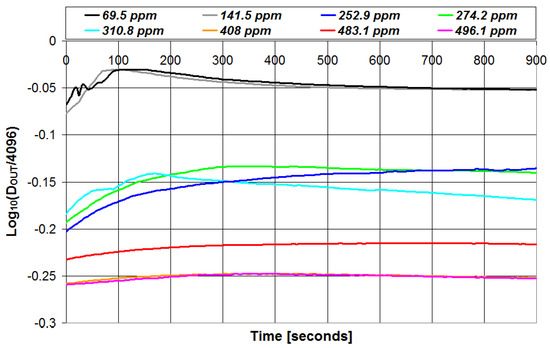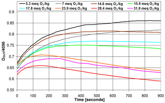 A set of eight olive oil samples has been used to calibrate the proposed portable instrument after the analytical parameters (PI and TPC) of each sample have been determined using the reference laboratory techniques. The intensity of the radiation transmitted through the emulsion has been monitored at time intervals of 5 s for a total of 900 s. The results are presented in Figure 6 and Figure 7 for the PI and TPC, respectively, in the case of all 8 samples. In the figures, the intensity of the transmitted radiation is reported with the parameter DOUT, which represents the digital value (between 0 and 4095) of the peak-to-peak voltage of the signal VOUT in Figure 4 when measured with the 12 bit ADC integrated in the microcontroller.