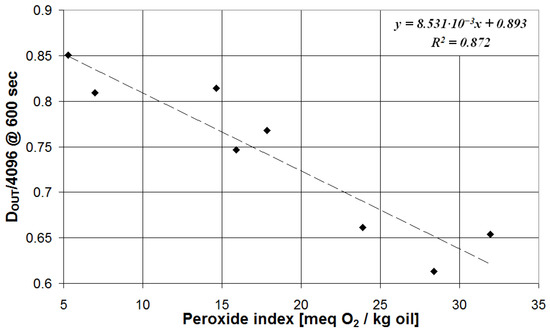 The value of DOUT for the target measurement time (600 s for PI and 500 s for TPC) has been plotted vs. the corresponding parameter determined with the reference technique for each olive oil sample from the calibration set. The results are presented in Figure 8 for the measurement of PI and in Figure 9 for the measurement of TPC.