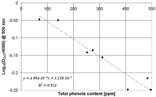In the case of TPC measurements, instead, the correlation between DOUT at 500 s and the TPC value determined with the reference technique is logarithmic, as can be seen in Figure 9, and the corresponding calibration equation (R2 = 0.924) is defined by the following: