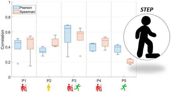 Box and whisker plots of Pearson and Spearman correlations of signals: RMS envelope of the EMG and HHB for STEP (red—sedentary; yellow—standing; red/green—mixed; green—active).