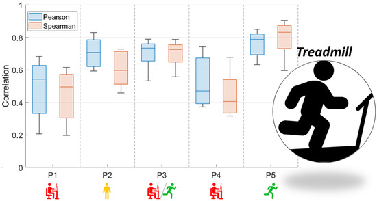 Box and whisker plots of Pearson and Spearman correlations of signals: RMS envelope of the EMG and HHB for TREADMILL (red—sedentary; yellow—standing; red/green—mixed; green—active).