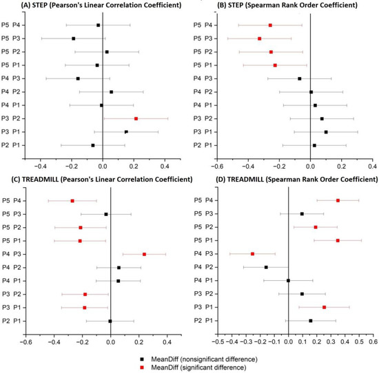 Figure 5 shows the results of the four Tukey tests for the four cases, and red indicates pairs that are statistically significantly different. In the case of the running protocol, these pairs represent participants with different levels of training. In the step protocol, no specific relationship can be demonstrated.