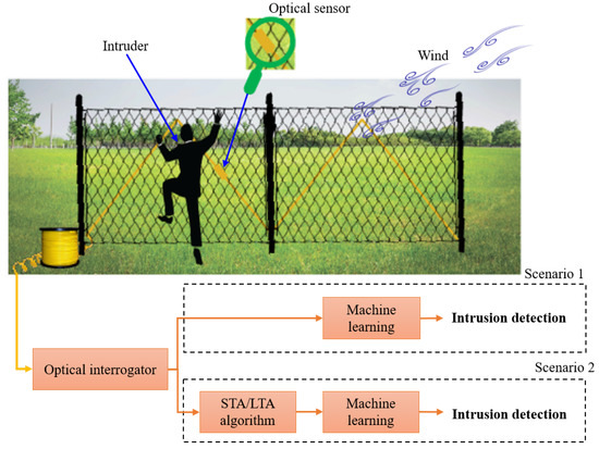 The concept of our paper is presented in Figure 1. An intruder is assumed to climb a fence wired with an FBG sensor. The FBG receives the light from the optical interrogator and reflects the light at a specific wavelength. The optical interrogator receives the reflected light and processes it. For example, for the “no intruder” conditions, the FBG will reflect the light at its specified Bragg wavelengths. However, when other conditions around the FBG occur (such as the intruder or wind), the Bragg wavelength shifts in the recorded optical spectrum in the optical interrogator. Here, we investigate two scenarios. In the first scenario, we train the machine learning models (i.e., the LDA algorithm or logistic regression) in the interrogator to identify the class of the intruder directly using the light signal reflected from the optical FBG. In the second scenario, we add the STA/LTA algorithm as a pre-processing stage for peak detection before the intruder detection ML models in the interrogator. In both scenarios, we train the ML models to classify the intruder as either: (i) no intruder, (ii) intruder, or (iii) wind. Ultimately, we compare the machine learning performance in the two scenarios and show the advantages of using the STA/LTA algorithm for peak detection as a pre-processing step for the machine learning model.