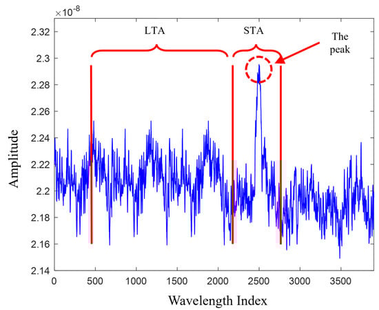 Figure 4 demonstrates identifying a peak in a noisy environment using the STA/LTA algorithm. Here, an event is present if the STA/LTA ratio () is higher than a predefined threshold (), where can be calculated in the following way: [50]: