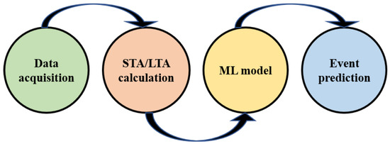 where is the ith sample of the digitized signal, S is the length of the STA window, and L is the length of the LTA window. In this study, we set the size of the short window to one sample and the size of the long window to 100 samples. The parameter is a coefficient computed using background noise to obtain a certain false alarm probability () that maximizes the probability of detection (). Figure 5 outlines the flow chart of the proposed integration between the STA/LTA algorithm and ML algorithms.