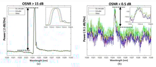 To build a training and testing dataset that helps in building the machine learning model, an outdoor fence was installed for this purpose. Figure 6a shows the installed fence at King Saud University, which is made of metal. The designed fence has dimensions of 8.8 m (length) × 1.7 m (height). The fence properties are presented in Table 2. The FBG sensor was attached to the fence as shown in Figure 6b using Scotch Magic Tape so that the FBG sensor can sense any vibration in the fence due to wind or climbing. To have a remote sensing system, the interrogator (PXIe-4844) was kept inside the lab connected to the FBG sensor through a 50 km of single-mode fiber (SMF-28) as shown in the experiment setup in Figure 6c. The FBG is also written on SMF-28 fiber. The interrogator is a module that transmits the light from a sweeping laser source and detects the reflections. The reflected light for the three scenarios at a distance of 50 km is presented in Figure 7a, where the wavelength shift could be observed with >15 dB of OSNR. In order to emulate the lower OSNR scenarios, we add an optical attenuator and adjust the OSNR level to lower than 0.5 dB as shown in Figure 7b. Here, it becomes obvious that conventional peak detection algorithm may not work well, leading to false alarms or missed events, and machine learning tools may help identify the intruder class by analyzing the features of the interrogator signal. Table 3 and Table 4 show the characteristics of the optical interrogator and the FBG sensor (OS3100) [51], respectively.