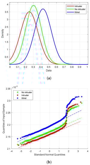 Figure 8a shows the statistical distribution of the data records. The x-axis (data axis) represents the values of data after normalization, while the y-axis (density axis) presents the proportion of these values. In Figure 8b, we show the Q-Q plots of the three classes. The figure clearly shows that the majority of the data (++ plot) of the three classes follow the theoretical quantiles (− plot), which means that the majority of the data follow a normal distribution; however, the higher values of the data (to the right) deviate slightly from the linear plot showing skewness in the data. This skewness is confirmed by the long right tail of the distributions of Figure 8a. Additionally, from Figure 8a,b, it is obvious that there is a linear shift between the distributions of the three data classes. Since the Q-Q plot curves are separable, the classifiers can work well with high classification accuracy.