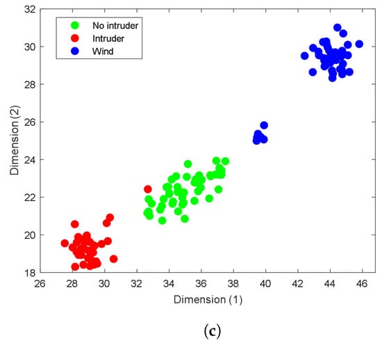 On the other hand, the t-SNE is a visualization and exploration algorithm that projects data samples from a higher-dimensional space to a vector of two points, each plotted in a plane, to facilitate the visualization of data samples in a 2D space [53,54]. The t-SNE algorithm provides a simple visualization sense compared to other visualization methods, such as box-plot or histograms, which require some statistical background to analyze the plots. This algorithm computes similarity measures between pairs of instances in the high- and low-dimensional spaces. The obtained measures are then optimized using a cost function. The t-SNE algorithm has been used in many applications, such as biomedical fields, genomics, and computer security [55]. The t-SNE algorithm plot displays the data as clusters in 2D. Each cluster represents one of the different classes in the problem. The classes can be classified easily if the clusters are separable, i.e., not overlapped. If overlapped, it is difficult to classify them with high accuracy.