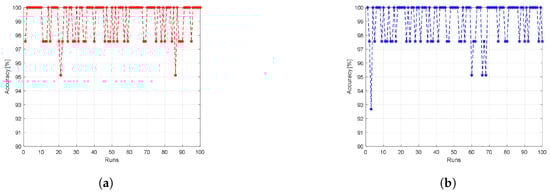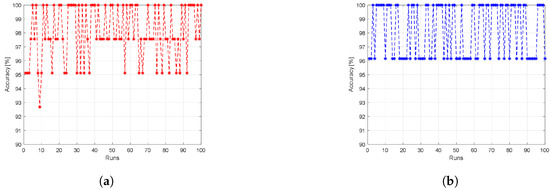 In the second scenario, we add the STA/LTA algorithm to the LDA and logistic regression ML models as a pre-processing stage. In the STA/LTA algorithm, we set the long window to 100 samples and the short window to one sample. The value of is set to be 1.028 to maintain the probability of a false alarm equal to 0.0224. The data before and after the STA/LTA algorithm are shown in Figure 10 for an arbitrary interrogator recorded signal. We notice that the STA/LTA algorithm can accurately extract the noisy signal peak. After peak detection using the STA/LTA algorithm, the reflected signal is cropped around the detected peak to form a window of size of 400 data points. Similar to the first scenario, we use 70% of the pre-processing dataset records for training the models, while the other 30% is used for testing. The results are averaged over 100 independent runs, where for each run, we train a new ML model using different and randomly selected data samples to ensure that the trained model is not biased to any subset of the dataset. The resulting accuracy of the LDA model is shown in Figure 11a, while Figure 11b depicts the resulting accuracy of the logistic regression model. The STA/LTA algorithm enhances the results and boosts the steadiness of the ML classification model, where most of the classification results now have values greater than 97% with an average accuracy over the 100 independent runs of 99.17% and 99% for the LDA and logistic regression classifiers, respectively. We note that because we use a new ML model for every run, we observe some variations in the results.