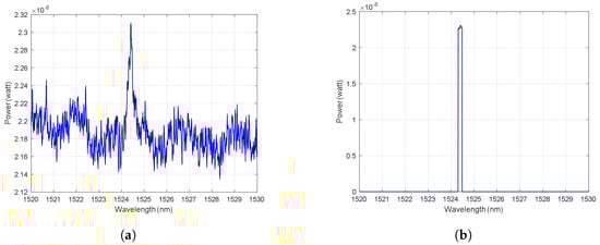 The FBG is a type of optical fiber sensor that is written on a short segment of a fiber. In the FBG sensor, the refractive index of the fiber’s core is periodically modified at a specific pitch [12]. When an FBG is exposed to a broadband light source, the FBG will reflect only the wavelengths of light that correspond to the Bragg wavelength (). All other wavelengths of light will pass through the FBG without being reflected. Any change in the physical environment surrounding the fiber will make the FBG characteristics, such as the refractive index () or grating pitch (), change, which affects the Bragg reflection wavelength allowing to sense the physical effects around the FBG. can be expressed as in Equation (1):