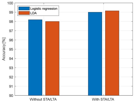 Comparison of the achieved results of the LDA and logistic regression classifiers with/without the STA/LTA algorithm.