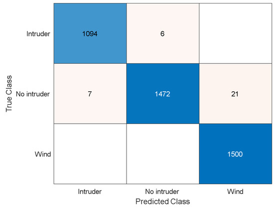 Finally, in Figure 12, we compare the achieved results of LDA and logistic regression classifiers with and without the STA/LTA algorithm. Additionally, in Figure 13, we present the confusion matrix of accumulated results of 100 independent runs of STA/LTA-LDA classifier. It is clearly shown that the “No intruder” class has the most misclassified samples, as those samples are perplexed with samples of the “Wind” class; some samples of the “intruder” class are confused with samples of the “No intruder” class, while all samples of the “Wind” class are correctly classified over 100 independent runs. Our results indicate that the three classes can be accurately classified correctly at low OSNR even for the small dataset of 134 records.