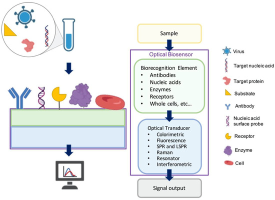Optical biosensors measure the optical signals as the changes in the optical properties and characteristics on the transducer surface in the case of an interaction of the immobilized biorecognition element with the measured substance [23,24,25]. Figure 1 shows a general illustration of an optical biosensor. The optical biosensor consists of an optical source, a transduction platform and an optical detector. Optical biosensors can use different types of biorecognition elements such as antibodies, aptamers, peptides, nucleic acids, peptide nucleic acids, proteins, enzymes, or whole cells on the transducer surface, which is designed to bind with the target substance specifically [26,27,28,29,30]. The optical transducer is integrated closely with the biosensing element. The optical biosensors are classified based on their transducers and can also be classified based on their dependence on a label for signal generation as label-based [31,32] and label-free [33,34,35,36,37]. In label-based biosensors, the detected signal originates from the label, such as a fluorophore or chromophore, conjugated to the detection molecule, which binds to the captured target. In contrast, in label-free biosensors, the signal produced by the interaction between the target and the biorecognition element is measured directly. In this section, we discuss a selection of surface-based optical biosensor technologies for the detection of viruses with an emphasis on their principles of detection and their applications in sensitive viral diagnostics.
