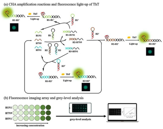 A multiplex imaging array was developed for the rapid and low-cost diagnosis of trace avian influenza virus (AIV) using DNA biomarkers by Jiang et al. (Figure 2) [51]. They detected three subtypes of AIV DNA biomarkers (H1N1, H7N9, and H5N1) simultaneously using fluorescence imaging and gray-level analysis. They utilized a smartphone for imaging the output and completed detection in 20 min. They employed catalytic hairpin assembly (CHA) amplification reactions and utilized thioflavin T, a specific G-quadruplex fluorescence probe for labeling. CHA is a non-enzymatic amplification technique that is commonly used for the detection of various nucleic acids with high sensitivity. In CHA, two complementary nucleic acid hairpins are used, which undergo a cascade of very quick hybridization events and, at the end, the final double helices are produced. These helices can generate fluorescence signal in a short time. In the study, the authors reached detection limits of 136 pM, 141 pM, and 129 pM for H1N1, H7N9, and H5N1, respectively. Moreover, the array sensors exhibited excellent anti-interference among the different subtypes and good mismatch discrimination in real samples. Such a system can easily be applied for the early detection of disease diagnostics in low-resource settings.