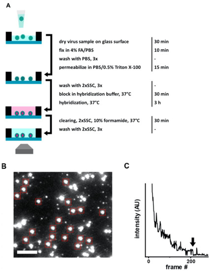 Another rapid viral detection and identification study was performed by Hepp et al. for detecting influenza virus, avian infectious bronchitis virus, and SARS-CoV-2 specifically and quantitatively in approximately 20 min (Figure 3) [52]. They used a fluorescence in situ hybridization (FISH) protocol, specifically a rapid viral FISH protocol (rvFISH), where they used fluorescence microscopy to spatially detect and quantify DNA and RNA inside fixed cells and tissues using complementary and fluorescently labeled oligos. They used a single-molecule TIRF microscope to image immobilized and stained virus particles, where they count the bound FISH probes by stepwise photobleaching (Figure 3C). They obtained Figure 3C by averaging the decrease in fluorescence intensity of the last bleaching step over several molecules, then obtained the average fluorescence intensity related to the single fluorophore of each FISH probe on the virus particle. They were able to detect influenza particles and infectious bronchitis virus (IBV), an avian coronavirus, down to a concentration of 105 PFU/ mL and 102 PFU/ mL, respectively, in a 20 min assay.