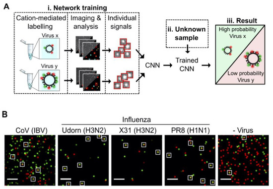 (A) Illustration of how the viruses are labeled and imaged to identify and classify different viruses using trained convolutional neural network (CNN). (B) Sample field of views for CoV (IBV), two strains of H3N2 influenza (A/Udorn/72 (Udorn), and A/Aichi/68 (X31)), an H1N1 influenza strain (A/PR8/8/34 (PR8)) detection, and a negative control. White boxes were used to point out merged red and green localizations as an example of colocalization. Scale bar, 10 μm. Reproduced with permission from [53]. Copyright © 2022 American Chemical Society.