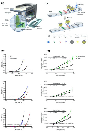 Moreover, Yeo et al. have demonstrated a field-level fluorescent lateral flow immunoassay that was combined with a smartphone-based fluorescent diagnostic device with an efficient reflective light-collection module for the detection of avian influenza (AI) (H5N1, H5N3, H7N1, and H9N2) (Figure 5a,b) [54]. The fluorescence light efficiency was improved with the use of latex beads along with the coumarin-derived dendrimer-based fluorescent as anti-influenza nanoparticles. The lowest detectable virus titers were found as 6.25 × 103 PFU/mL for H5N3, 5.34 × 102 PFU/mL for H7N1, and 5.23 × 101 PFU/mL for H9N2 in throat-swab samples. The diagnostic test system was also compared with sandwich ELISA in the quantification of all the virus samples both in distilled water (DW) and normal throat swabs. The results showed that the proposed smartphone device had an improved diagnostic performance compared to ELISA and the table-top version. In addition, clinical validation of a smartphone-based diagnostic device with H5N1-infected patient samples was completed within 15 min with a sensitivity of 96.55% (28/29) [95% confidence interval (CI): 82.24 to 99.91] and a specificity of 98.55% (68/69) (95% CI: 92.19 to 99.96) (p < 0.0001).