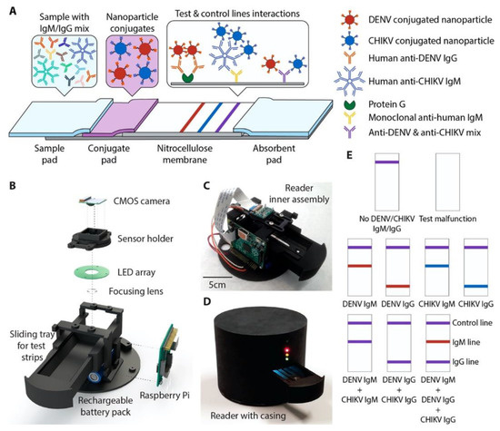 (A) A 4-plex colorimetric lateral-flow test strip and an optical readout device. Red and blue nanoparticle conjugates in the conjugate pad bind to DENV and CHIKV antibodies in the sample, respectively. Nanoparticle-IgG complexes are captured by the first test line (red), and nanoparticle-IgM complexes are captured by the second test line (blue), causing a color change. When both DENV and CHIKV antibodies of the same isotype are present, a mixture of red and blue (purple) appears at the test line. Unbound nanoparticle conjugates are captured at the control line (purple). (B) Parts of the optical reader. (C) Inner view of the optical reader. (D) Fully assembled version of optical reader with lightproof casing. (E) Examples showing the color development on the test strip for various cases. Reproduced with permission from [61]. Copyright © 2019 American Chemical Society.