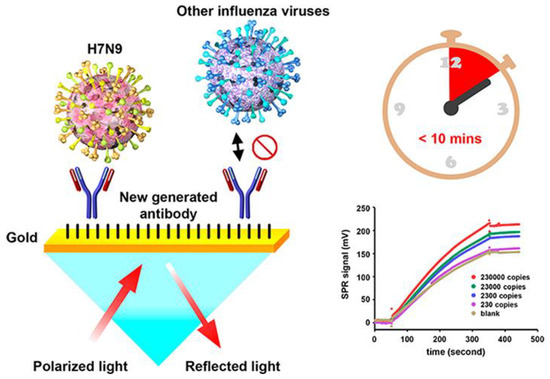 Chang et al. developed an intensity-modulated surface plasmon resonance (IM-SPR) biosensor integrated with a newly generated monoclonal antibody that enables the rapid and sensitive detection of a new strain of avian influenza A H7N9 virus that emerged in China in 2013. [71]. The novel antibody displays high specificity for the H7N9 virus compared with other human influenza viruses. They experimentally reported a detection limit of 144 copies/mL using the proposed approach for the H7N9 virus, which is a 20-fold increase in sensitivity compared with homemade target-captured ELISA. They reported a less than 10 min assay time. 10 μg/mL of the capture antibody H7-mAb was covalently immobilized to the reaction spot of the SPR chip through mixed self-assembled monolayers of 11-mercaptoundecanoic acid and 6-Mercapto-1-hexanol (1:9) via the amine coupling protocol (Figure 7). The results demonstrated that the simple SPR-based technology was successfully used in sensitive H7N9 virus detection. They reported that the proposed SPR system can be used in the implementation of other emerging virus-detection platforms.