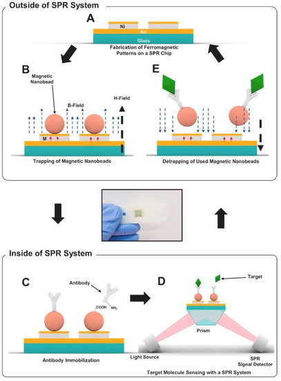 As effective and simple methods are needed for virus detection, Yoo et al. designed a reusable magnetic SPR sensor chip for H1N1 influenza virus detection in a conventional SPR sensor. They used ferromagnetic patterns on an SPR sensor chip to prepare a layer of magnetic particles and a solid substrate for SPR sensing [72]. They demonstrated a sensor platform which enables repetitive use of the SPR chip by removing magnetic particles at the end of an experiment using external magnetic fields without the need for antibody-modifying processes. Figure 8 shows the schematic of virus detection using antibodies conjugated to magnetic beads on the substrate. Figure 8A,B depict the ferromagnetic nickel patterns and trapping of magnetic particles on the SPR chip, and Figure 8C schematizes the antibody immobilization on magnetic particles using EDC-NHS coupling. Figure 8D,E show the detection of target molecules and then the removal of the magnetic particles with an external magnetic field, respectively. The magnetic particles on the sensor chip surface are removed using strong external magnetic fields so that the aggregation of magnetic particles on the sensor surface is reduced. The nucleoprotein (NP) of H1N1 influenza virus was applied to the SPR sensor at concentrations between 300 ng/mL and 10 μg/mL. A larger increase in the SPR signal was reported with a higher concentration of the NP solution. This study showed the use of a single reusable SPR chip for the detection of NPs of H1N1 influenza virus for more than seven times without drastic signal degradation. The cost of the SPR sensing was significantly reduced by reusing the SPR chip repeatedly.