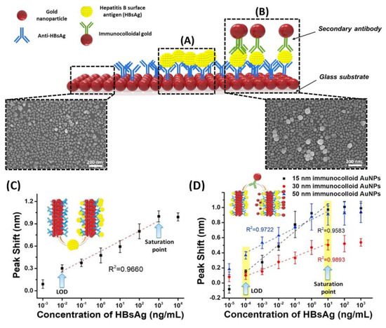 Kim et al. designed a unique structure that used gold nanoparticles (AuNPs) to develop a highly sensitive method for the hepatitis B surface antigen (HBsAg) detection [79]. They designed a single-layered LSPR chip format via antigen–antibody reaction-based detection symmetry using AuNPs. The virus was sandwiched between two different sizes of AuNPs on a glass substrate fabricated with AuNPs. In their study, two AuNPs in close proximity repulse each other in a plasmon resonance state in the presence of the virus, resulting in a stronger peak shift effect than that in the non-sandwich state. A diagrammatic of the LSPR biosensor chip is shown in Figure 9A,B. They showed that implementation-based systems are affected by the particle size in LSPR system. Different concentrations of HBsAg from 1 pg/mL to 1 μg/mL were applied in the single assay LSPR chip format. As shown in Figure 9C, a 10 pg/mL limit of detection value was obtained (Figure 9D). They fabricated a modified detection format to further improve the detection limit by fixing a secondary antibody to the AuNP monolayer, which achieved a 100-times sensitive detection. They showed highly sensitive detection of HBsAg, at 100 fg/mL within 10–15 min, using a novel sandwich immunoassay LSPR chip. Furthermore, the increase in the HBsAg concentration directly caused an increase in the LSPR signals.