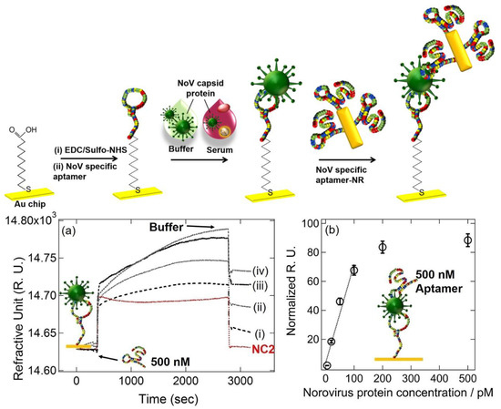 Kim et al. developed a gold-nanorod-enhanced surface sandwich assay for norovirus (NoV) capsid protein detection via a novel pair of aptamers, in conjunction with SPR [80]. They used four different DNA aptamer sequences that were known to be specific for the NoV protein to find the strongest binding constant. The aptamer II sequences were covalently bonded onto a chemically modified thin Au chip surface. For the formation of the surface sandwich complex, the NoV-specific aptamer was attached to the surface of the SPR chip, which was modified via 1-Ethyl-3-(3-dimethylaminopropyl)-carbodiimide hydrochloride and N-(hydroxy-sulfosuccinimide) solution. Then, the NoV capsid protein and gold-nanorod-enhanced aptamer were adsorbed. The authors reported a 50 aM limit of detection value for the NoV capsid protein after flowing different concentrations of NoV protein solutions over the aptamer-modified chip. The NoV capsid protein concentrations were also analyzed in human serum samples. The schematization of the aptamer–aptamer sandwich assay strategy and representative SPR sensorgrams are shown in Figure 10.
