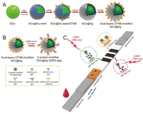 (A) Schematic of the dual-layer DTNB-modified SiO2–Ag NPs. (B) Schematic of the preparation of the SARS-CoV-2 S-protein-modified SiO2–Ag SERS probes. (C) Simultaneous highly-sensitive anti-SARS-CoV-2 IgM/IgG identification using the SERS-LFIA strip. Reproduced with permission from [88]. Copyright © 2021 Elsevier.